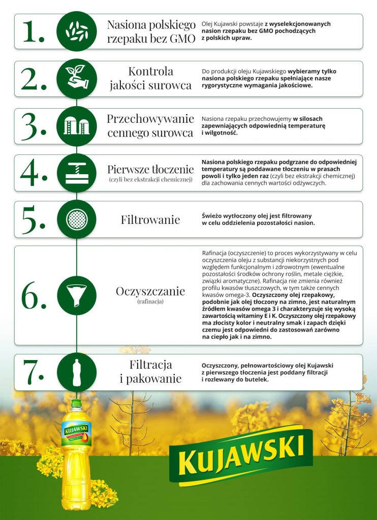 Olej rzepakowy Kujawski jest produkowany z polskiego rzepaku. Współpraca z wyselekcjonowanymi dostawcami i wieloetapowa kontrola surowca gwarantują, że do produkcji olejów marki Kujawski wykorzystywane są sprawdzone nasiona rzepaku bez GMO, a w przypadku linii olejów premium w szklanych butelkach, także inne nasiona oraz zioła.