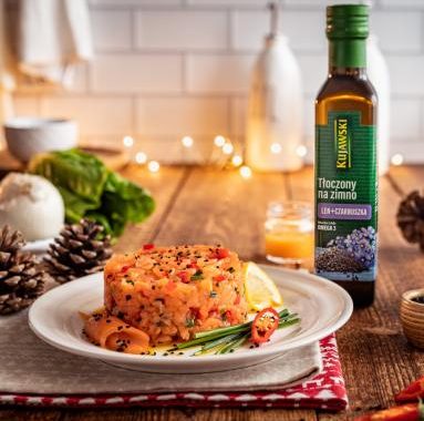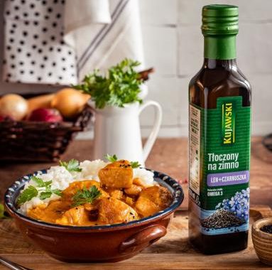 Kujawski LEN + CZARNUSZKA tłoczony na zimno powstaje ze starannie wyselekcjonowanych nasion lnu i aromatycznej czarnuszki. Nasiona lnu i czarnuszki poddawane są mechanicznemu tłoczeniu na zimno (w temperaturze do 50°C), dzięki czemu olej zachowuje swój złocisty kolor, a także wyjątkowe właściwości i aromat nasion czarnuszki. Dzięki temu linia Kujawski LEN tłoczony na zimno z ziołami charakteryzuje się unikalnymi, nowymi smakami w połączeniu z cennymi właściwościami tradycyjnego oleju lnianego. Kujawski LEN + CZARNUSZKA to naturalne źródło kwasu Omega-3.